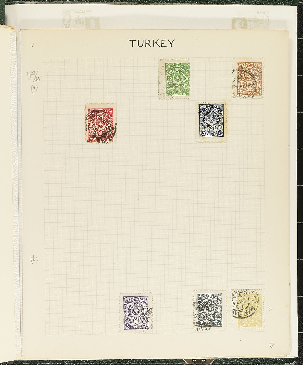 A pair of collections of used stamps going from 1876 to the late 1970's, neatly mounted on quadrilled pages, in springback albums (one "Adelphi" the other "Toronto" from Mark’s Stamp Company!). Despite being from different sources, there is no overlap, and the makes for a great way to start a collection of this European-Middle Eastern hybrid. Probably about 400 different stamps, with a little bit from the "back of the book". Owner’s meticulous 2024 Scott US$415.00 =