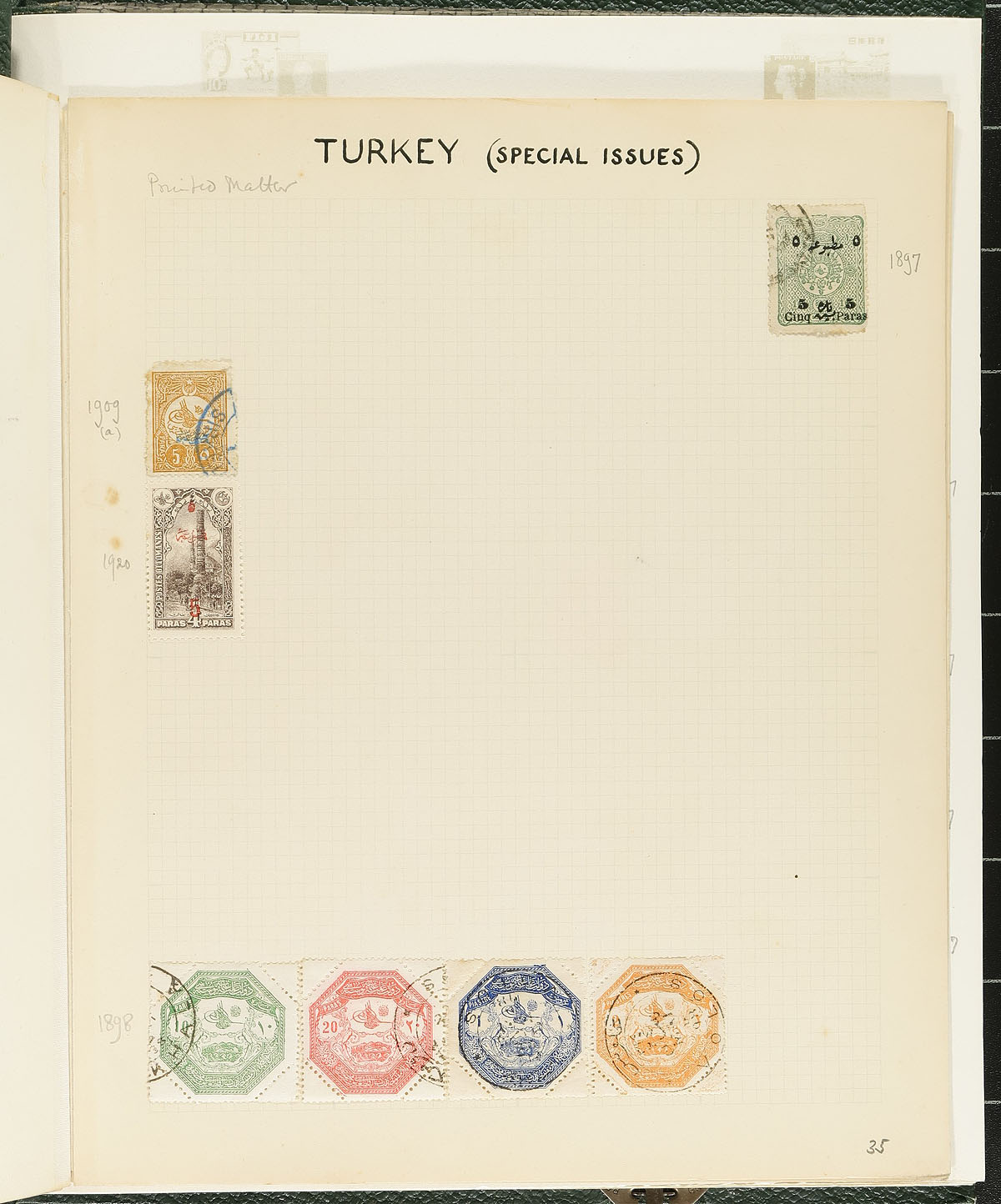 A pair of collections of used stamps going from 1876 to the late 1970's, neatly mounted on quadrilled pages, in springback albums (one "Adelphi" the other "Toronto" from Mark’s Stamp Company!). Despite being from different sources, there is no overlap, and the makes for a great way to start a collection of this European-Middle Eastern hybrid. Probably about 400 different stamps, with a little bit from the "back of the book". Owner’s meticulous 2024 Scott US$415.00 =