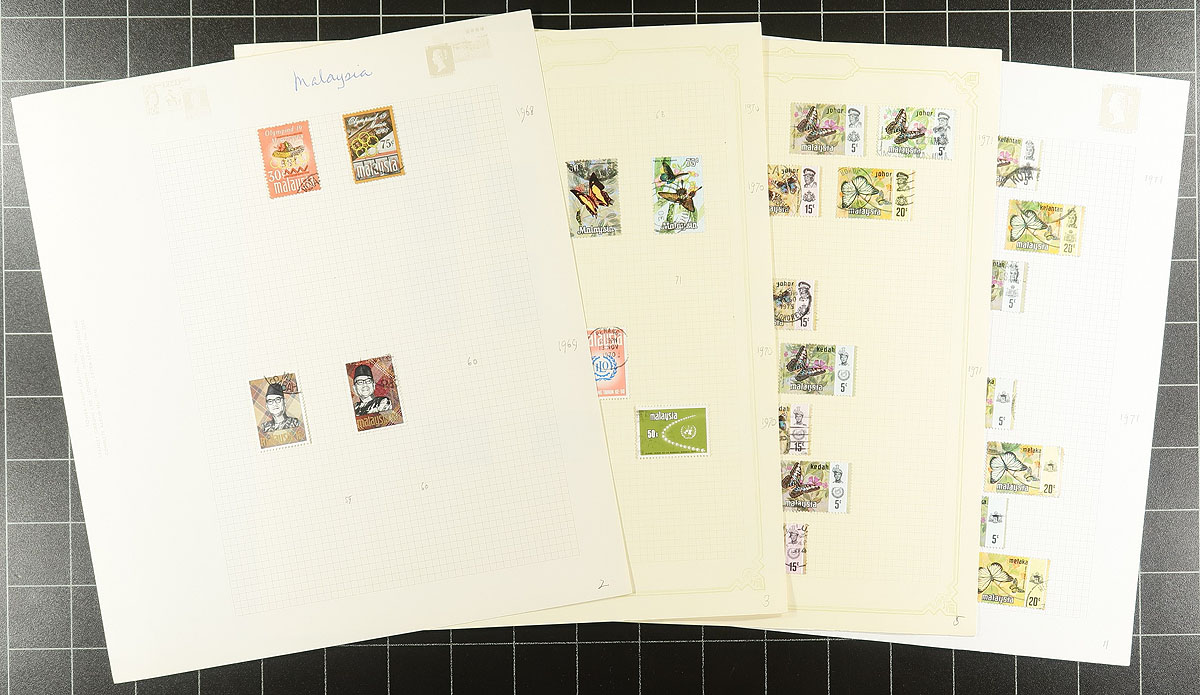 Two used collections which nicely complement each other. The "States" section is impressive, with a wide range of issues from the King George VI to early Queen Elizabeth period, including some sets, lots of nice cancels, a few pairs and a surprising number of denominations in the $1-$5 range (these are often much harder to find used, than mint). This section catalogues $950.00. The Malaysia (with some from the Malaysian states, particularly "butterflies") goes up to 1979 (this section catalogues $175.00). All are mounted on quadrilled pages and the overall quality is quite nice. 2024 Scott catalogue value US$1125.00 =