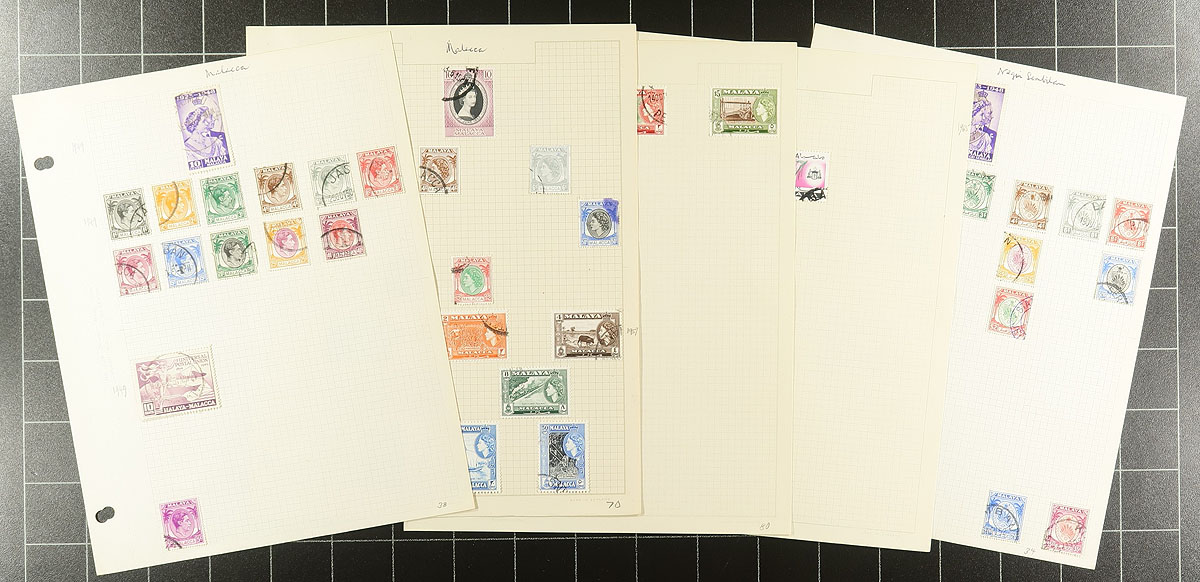 Two used collections which nicely complement each other. The "States" section is impressive, with a wide range of issues from the King George VI to early Queen Elizabeth period, including some sets, lots of nice cancels, a few pairs and a surprising number of denominations in the $1-$5 range (these are often much harder to find used, than mint). This section catalogues $950.00. The Malaysia (with some from the Malaysian states, particularly "butterflies") goes up to 1979 (this section catalogues $175.00). All are mounted on quadrilled pages and the overall quality is quite nice. 2024 Scott catalogue value US$1125.00 =