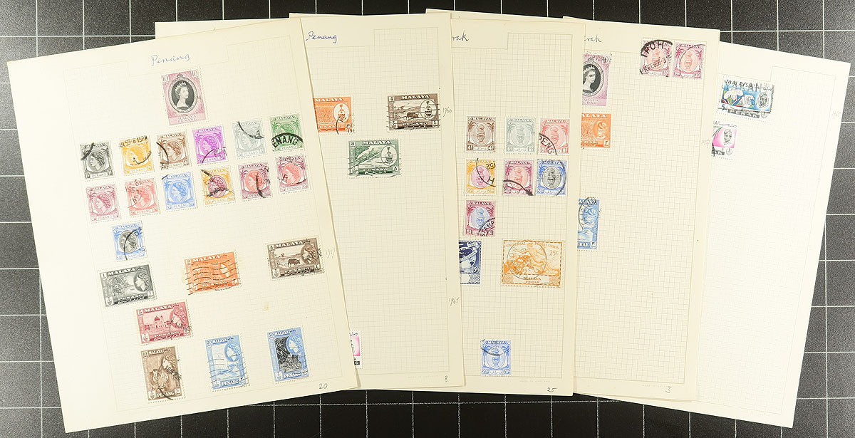 Two used collections which nicely complement each other. The "States" section is impressive, with a wide range of issues from the King George VI to early Queen Elizabeth period, including some sets, lots of nice cancels, a few pairs and a surprising number of denominations in the $1-$5 range (these are often much harder to find used, than mint). This section catalogues $950.00. The Malaysia (with some from the Malaysian states, particularly "butterflies") goes up to 1979 (this section catalogues $175.00). All are mounted on quadrilled pages and the overall quality is quite nice. 2024 Scott catalogue value US$1125.00 =