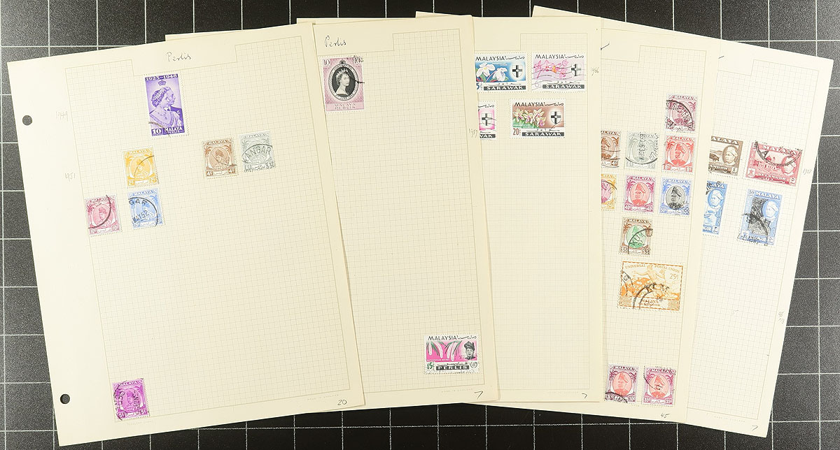 Two used collections which nicely complement each other. The "States" section is impressive, with a wide range of issues from the King George VI to early Queen Elizabeth period, including some sets, lots of nice cancels, a few pairs and a surprising number of denominations in the $1-$5 range (these are often much harder to find used, than mint). This section catalogues $950.00. The Malaysia (with some from the Malaysian states, particularly "butterflies") goes up to 1979 (this section catalogues $175.00). All are mounted on quadrilled pages and the overall quality is quite nice. 2024 Scott catalogue value US$1125.00 =