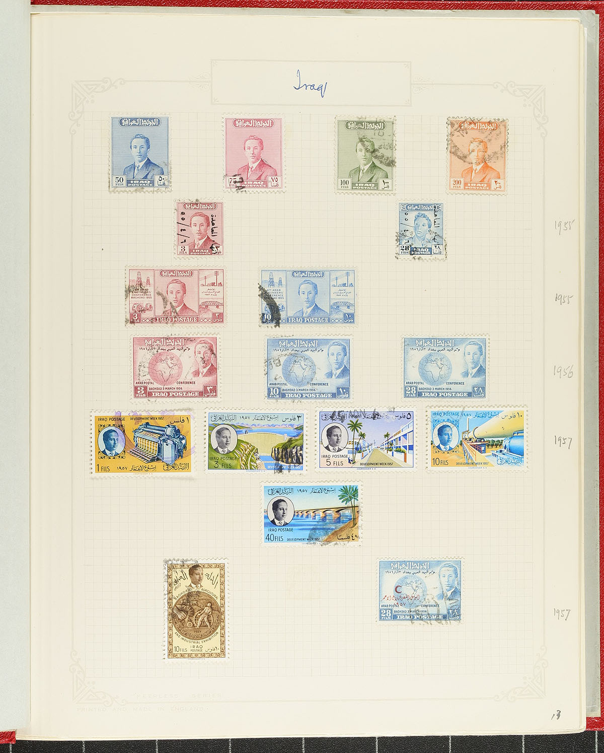 An eclectic mix of mounted collections with used pre-1980 material all on quadrilled pages (some loose, a couple in springback binders, including a nice, red SG "Tower"). Neatly organized and meticulously catalogued by the consignor, with little duplication and few, if any, faulty. In order of catalogue value there is: Vatican City ($260.00), Nepal ($210.00), post-war Poland ($190.00), Iraq ($151.00) and Israel ($70.00). Total 2024 Scott US$881.00 =
