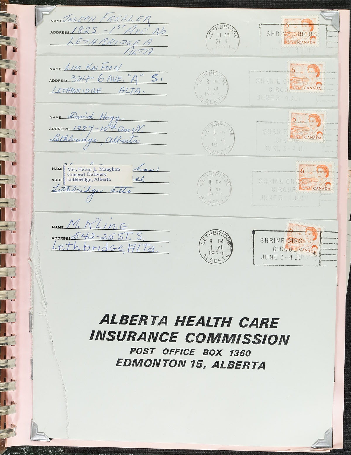 QEII Postal History Part 1. Seven binders filled with commercial covers from 1968-1972 with covers sorted for various themes. The Centennials include a binder each of 6c black and orange with single frankings on fluorescent paper (this material was assembled in the early 1970’s, so there may be a range of different paper types that were not recognized at the time). There is a binder each of the 7c and 8c Centennial, perfect for the "calendar date" collector. One binder has commemoratives, Christmas and Centennials all commercially used on the first day of issue. Fills a U-Haul box, conservatively 1000 covers, mostly used in Alberta. Estimate =