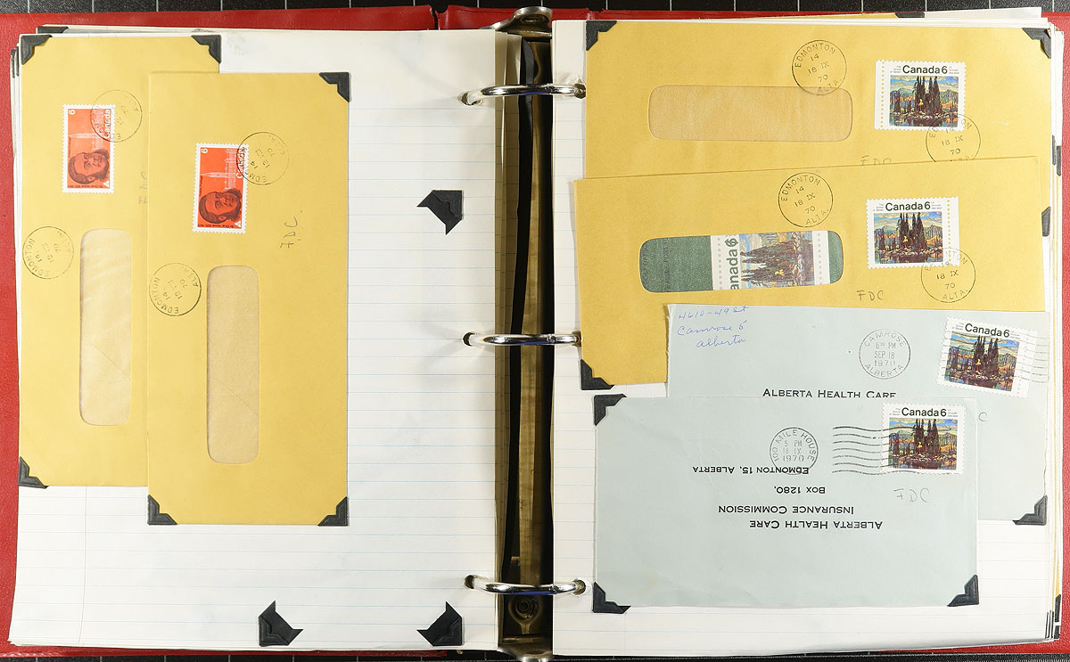 QEII Postal History Part 1. Seven binders filled with commercial covers from 1968-1972 with covers sorted for various themes. The Centennials include a binder each of 6c black and orange with single frankings on fluorescent paper (this material was assembled in the early 1970’s, so there may be a range of different paper types that were not recognized at the time). There is a binder each of the 7c and 8c Centennial, perfect for the "calendar date" collector. One binder has commemoratives, Christmas and Centennials all commercially used on the first day of issue. Fills a U-Haul box, conservatively 1000 covers, mostly used in Alberta. Estimate =