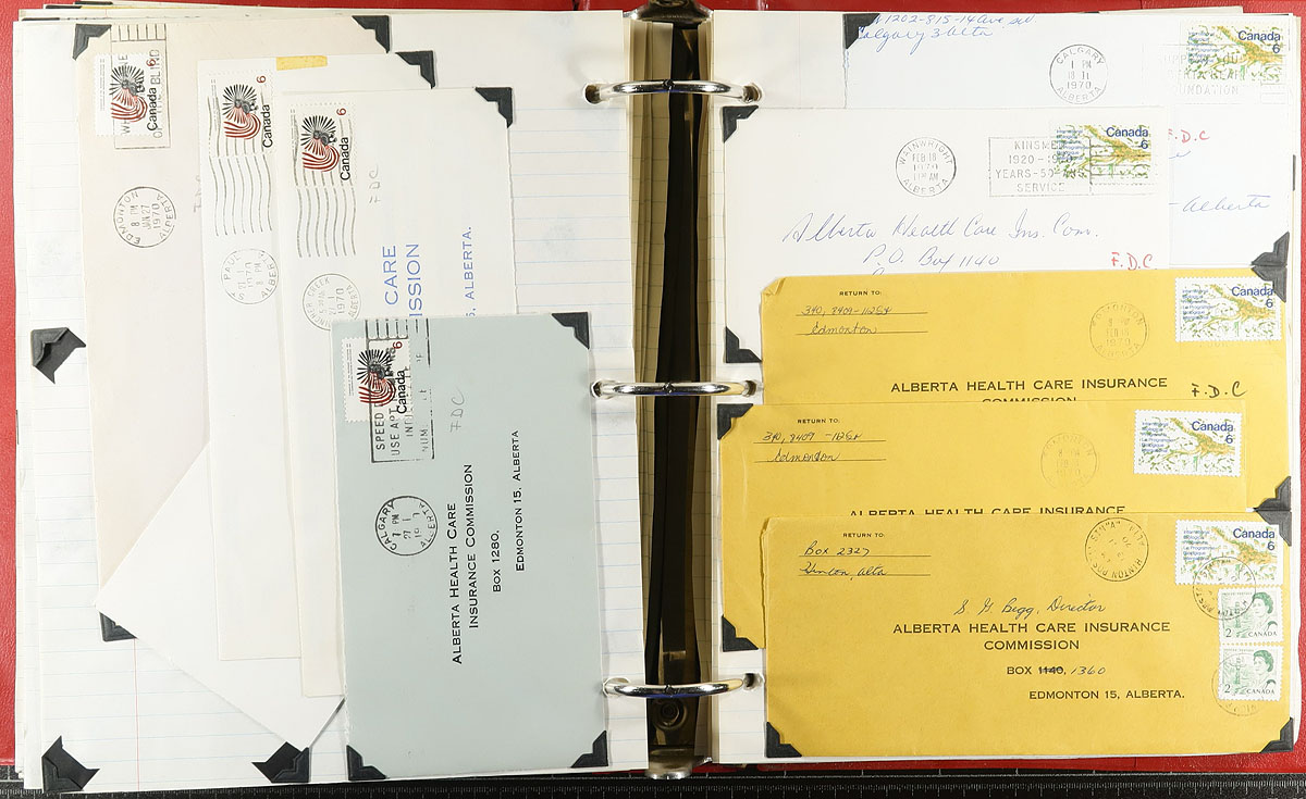 QEII Postal History Part 1. Seven binders filled with commercial covers from 1968-1972 with covers sorted for various themes. The Centennials include a binder each of 6c black and orange with single frankings on fluorescent paper (this material was assembled in the early 1970’s, so there may be a range of different paper types that were not recognized at the time). There is a binder each of the 7c and 8c Centennial, perfect for the "calendar date" collector. One binder has commemoratives, Christmas and Centennials all commercially used on the first day of issue. Fills a U-Haul box, conservatively 1000 covers, mostly used in Alberta. Estimate =