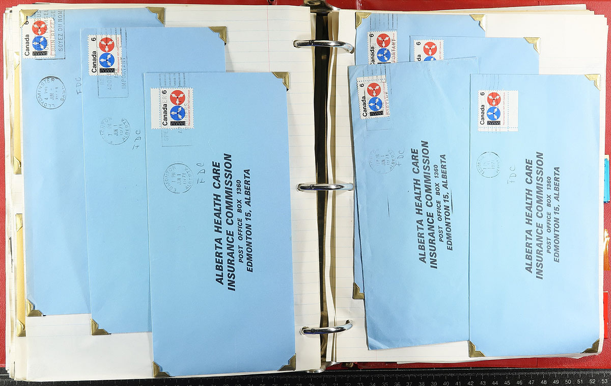 QEII Postal History Part 1. Seven binders filled with commercial covers from 1968-1972 with covers sorted for various themes. The Centennials include a binder each of 6c black and orange with single frankings on fluorescent paper (this material was assembled in the early 1970’s, so there may be a range of different paper types that were not recognized at the time). There is a binder each of the 7c and 8c Centennial, perfect for the "calendar date" collector. One binder has commemoratives, Christmas and Centennials all commercially used on the first day of issue. Fills a U-Haul box, conservatively 1000 covers, mostly used in Alberta. Estimate =