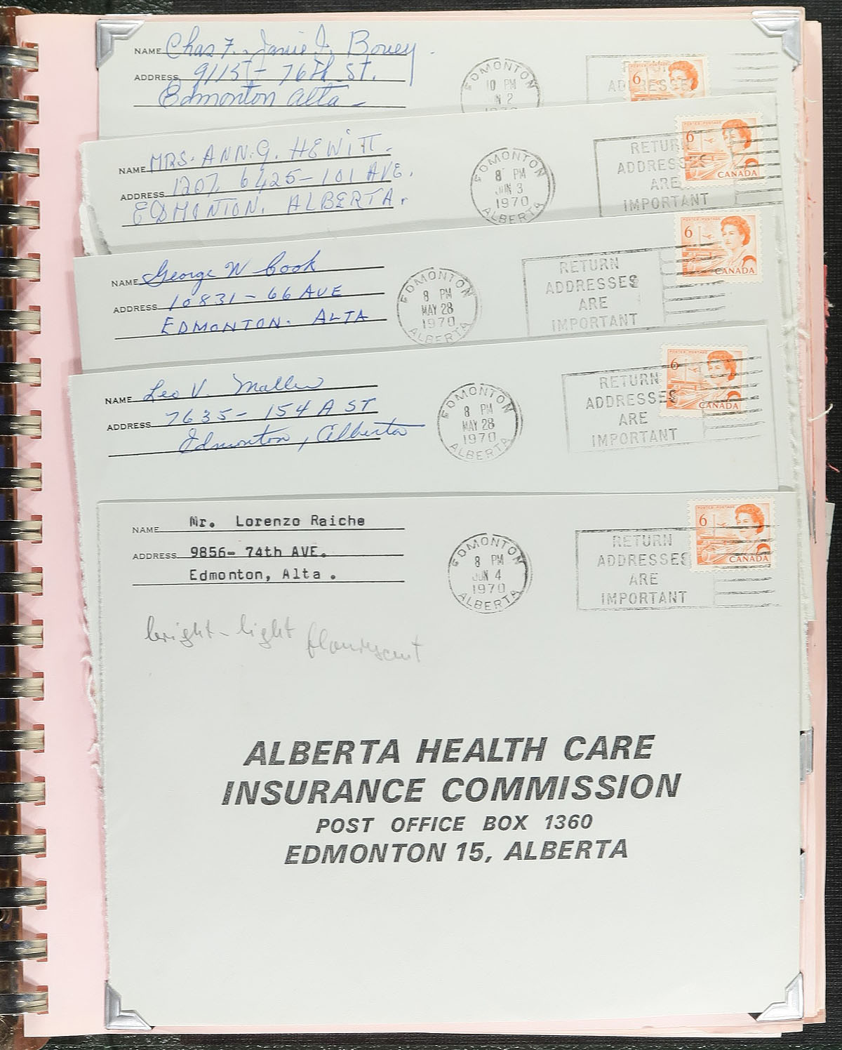 QEII Postal History Part 1. Seven binders filled with commercial covers from 1968-1972 with covers sorted for various themes. The Centennials include a binder each of 6c black and orange with single frankings on fluorescent paper (this material was assembled in the early 1970’s, so there may be a range of different paper types that were not recognized at the time). There is a binder each of the 7c and 8c Centennial, perfect for the "calendar date" collector. One binder has commemoratives, Christmas and Centennials all commercially used on the first day of issue. Fills a U-Haul box, conservatively 1000 covers, mostly used in Alberta. Estimate =