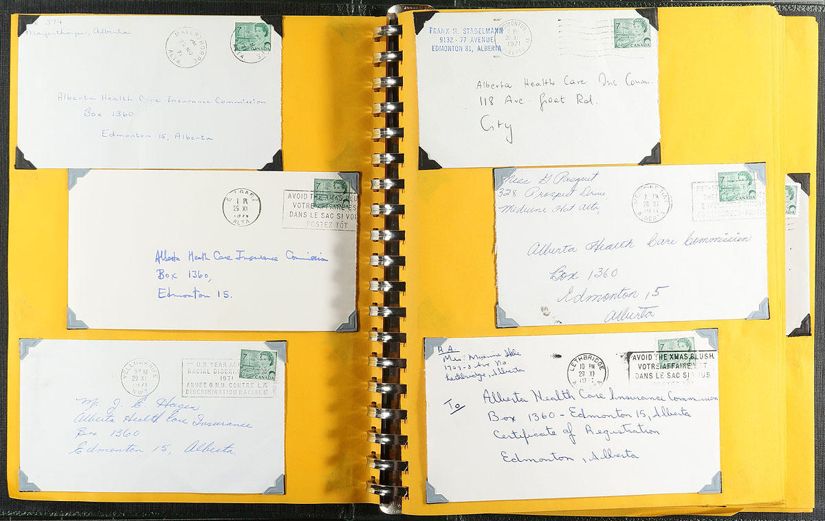 QEII Postal History Part 1. Seven binders filled with commercial covers from 1968-1972 with covers sorted for various themes. The Centennials include a binder each of 6c black and orange with single frankings on fluorescent paper (this material was assembled in the early 1970’s, so there may be a range of different paper types that were not recognized at the time). There is a binder each of the 7c and 8c Centennial, perfect for the "calendar date" collector. One binder has commemoratives, Christmas and Centennials all commercially used on the first day of issue. Fills a U-Haul box, conservatively 1000 covers, mostly used in Alberta. Estimate =