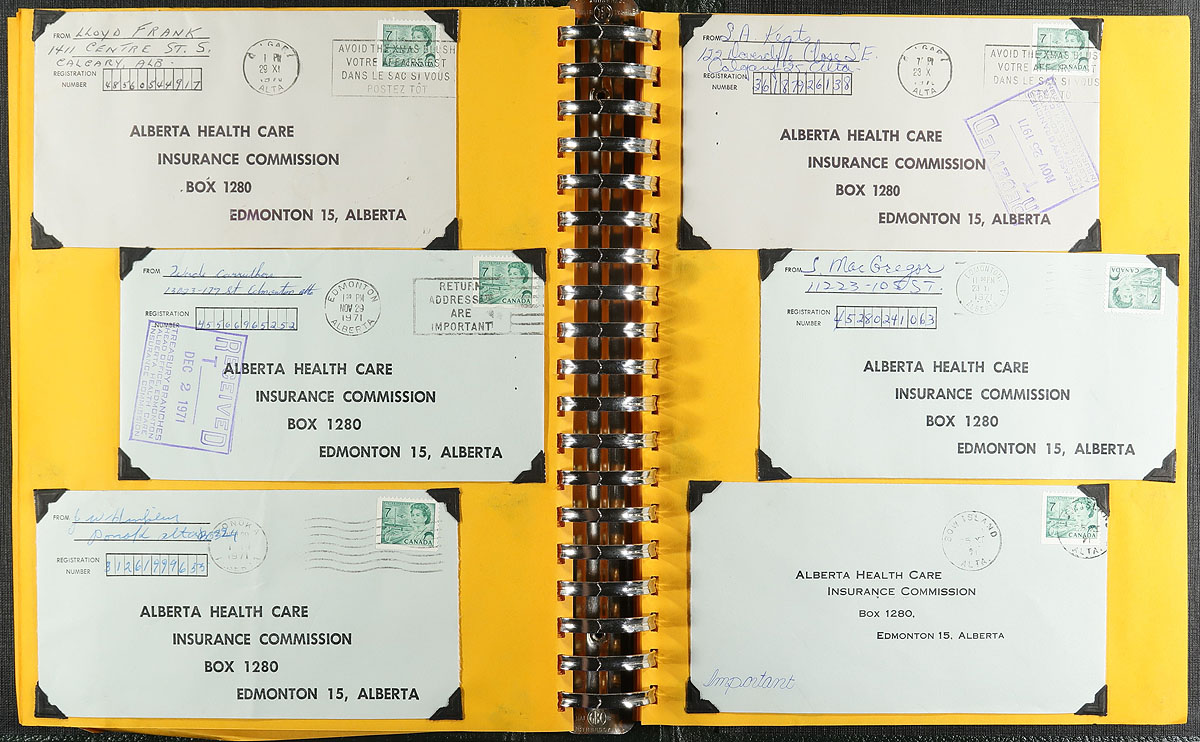 QEII Postal History Part 1. Seven binders filled with commercial covers from 1968-1972 with covers sorted for various themes. The Centennials include a binder each of 6c black and orange with single frankings on fluorescent paper (this material was assembled in the early 1970’s, so there may be a range of different paper types that were not recognized at the time). There is a binder each of the 7c and 8c Centennial, perfect for the "calendar date" collector. One binder has commemoratives, Christmas and Centennials all commercially used on the first day of issue. Fills a U-Haul box, conservatively 1000 covers, mostly used in Alberta. Estimate =
