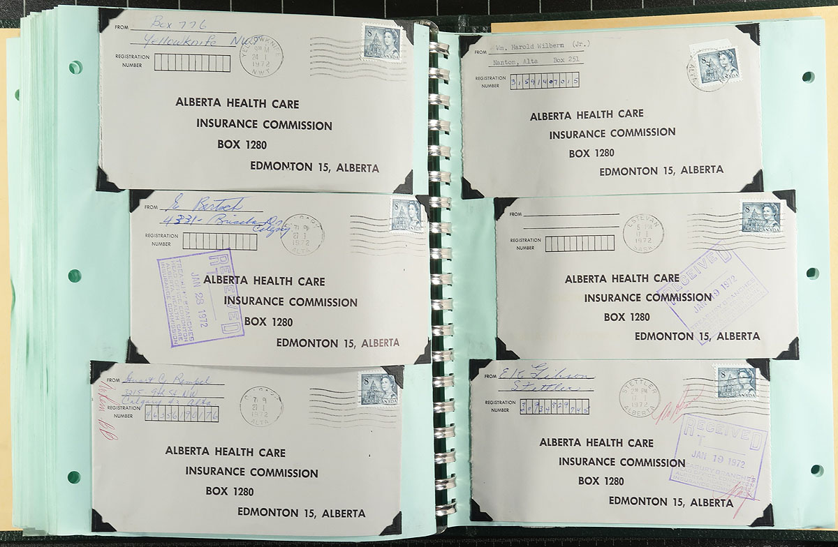 QEII Postal History Part 1. Seven binders filled with commercial covers from 1968-1972 with covers sorted for various themes. The Centennials include a binder each of 6c black and orange with single frankings on fluorescent paper (this material was assembled in the early 1970’s, so there may be a range of different paper types that were not recognized at the time). There is a binder each of the 7c and 8c Centennial, perfect for the "calendar date" collector. One binder has commemoratives, Christmas and Centennials all commercially used on the first day of issue. Fills a U-Haul box, conservatively 1000 covers, mostly used in Alberta. Estimate =