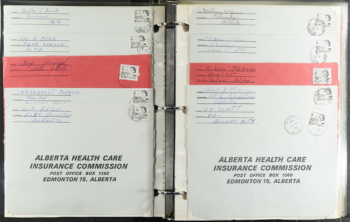 QEII Postal History Part 1. Seven binders filled with commercial covers from 1968-1972 with covers sorted for various themes. The Centennials include a binder each of 6c black and orange with single frankings on fluorescent paper (this material was assembled in the early 1970’s, so there may be a range of different paper types that were not recognized at the time). There is a binder each of the 7c and 8c Centennial, perfect for the "calendar date" collector. One binder has commemoratives, Christmas and Centennials all commercially used on the first day of issue. Fills a U-Haul box, conservatively 1000 covers, mostly used in Alberta. Estimate =