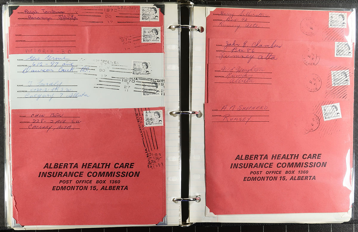 QEII Postal History Part 1. Seven binders filled with commercial covers from 1968-1972 with covers sorted for various themes. The Centennials include a binder each of 6c black and orange with single frankings on fluorescent paper (this material was assembled in the early 1970’s, so there may be a range of different paper types that were not recognized at the time). There is a binder each of the 7c and 8c Centennial, perfect for the "calendar date" collector. One binder has commemoratives, Christmas and Centennials all commercially used on the first day of issue. Fills a U-Haul box, conservatively 1000 covers, mostly used in Alberta. Estimate =