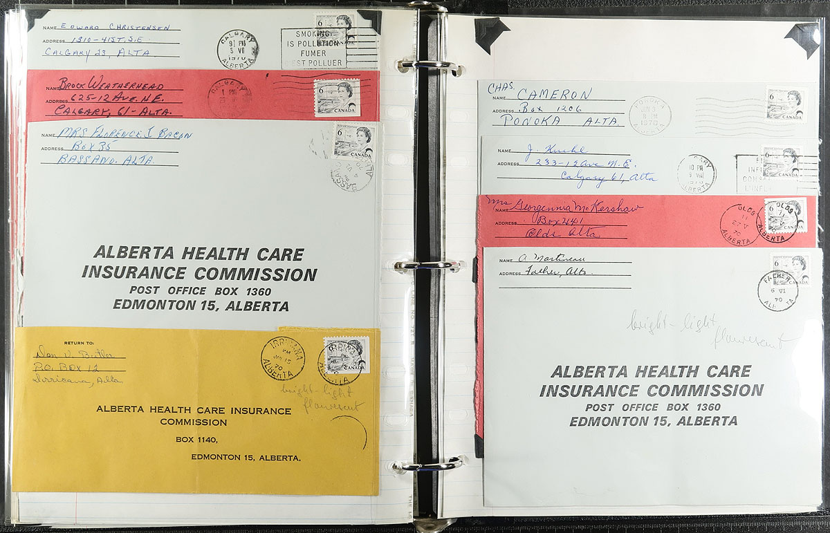 QEII Postal History Part 1. Seven binders filled with commercial covers from 1968-1972 with covers sorted for various themes. The Centennials include a binder each of 6c black and orange with single frankings on fluorescent paper (this material was assembled in the early 1970’s, so there may be a range of different paper types that were not recognized at the time). There is a binder each of the 7c and 8c Centennial, perfect for the "calendar date" collector. One binder has commemoratives, Christmas and Centennials all commercially used on the first day of issue. Fills a U-Haul box, conservatively 1000 covers, mostly used in Alberta. Estimate =