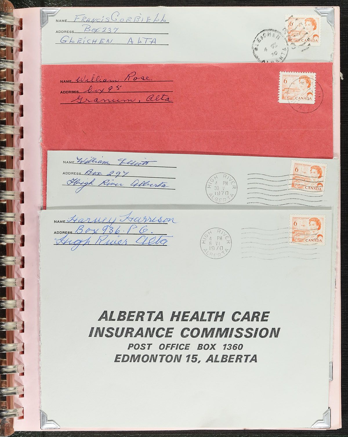 QEII Postal History Part 1. Seven binders filled with commercial covers from 1968-1972 with covers sorted for various themes. The Centennials include a binder each of 6c black and orange with single frankings on fluorescent paper (this material was assembled in the early 1970’s, so there may be a range of different paper types that were not recognized at the time). There is a binder each of the 7c and 8c Centennial, perfect for the "calendar date" collector. One binder has commemoratives, Christmas and Centennials all commercially used on the first day of issue. Fills a U-Haul box, conservatively 1000 covers, mostly used in Alberta. Estimate =