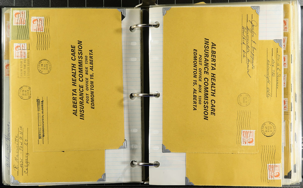 QEII Postal History Part 2. Five binders of commercial covers from 1969-1972 by a collector who was fascinated by the fluorescent paper experiments of the time and had access to a large source of mail. This group contains 2 binders of the "Osler" and 1 of the "ILO" issues with commercial first day covers. There is a binder of the 6c orange Centennial, with stamps purported to have various degrees of fluorescent paper. The lot ends with a binder of 6c black cut squares with a wide range of machine, slogan and CDS cancels. Almost all the cancels in this lot are from Alberta. A great lot for the collector with a good UV light. Several hundred covers and a few hundred cut squares. Estimate =
