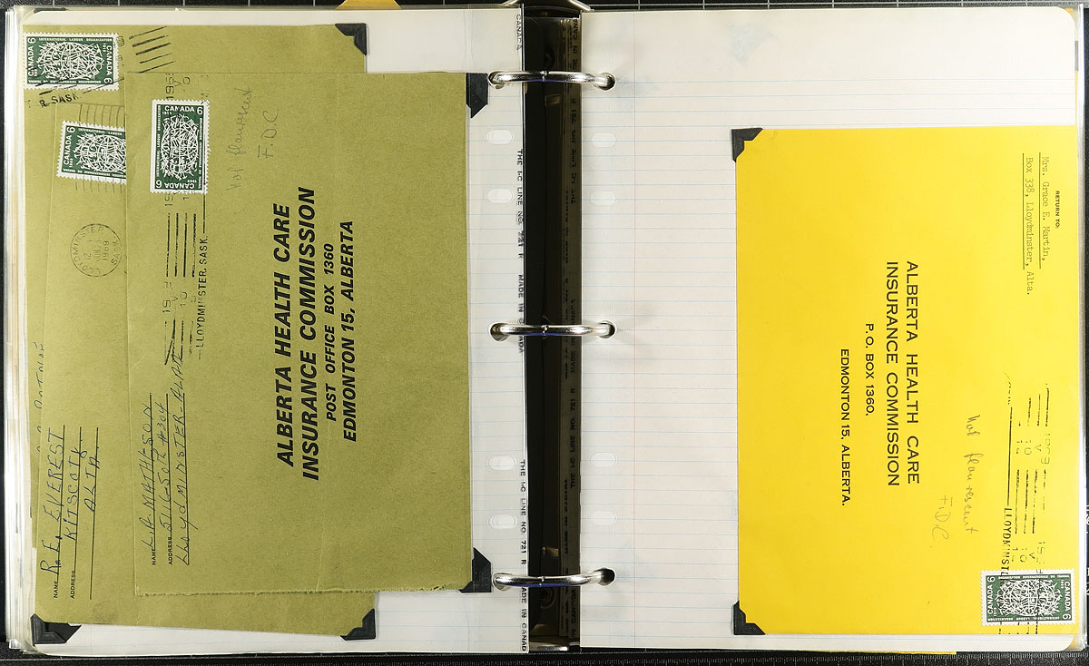 QEII Postal History Part 2. Five binders of commercial covers from 1969-1972 by a collector who was fascinated by the fluorescent paper experiments of the time and had access to a large source of mail. This group contains 2 binders of the "Osler" and 1 of the "ILO" issues with commercial first day covers. There is a binder of the 6c orange Centennial, with stamps purported to have various degrees of fluorescent paper. The lot ends with a binder of 6c black cut squares with a wide range of machine, slogan and CDS cancels. Almost all the cancels in this lot are from Alberta. A great lot for the collector with a good UV light. Several hundred covers and a few hundred cut squares. Estimate =