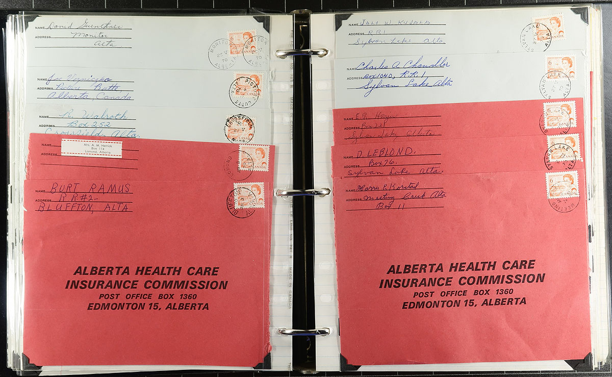 QEII Postal History Part 2. Five binders of commercial covers from 1969-1972 by a collector who was fascinated by the fluorescent paper experiments of the time and had access to a large source of mail. This group contains 2 binders of the "Osler" and 1 of the "ILO" issues with commercial first day covers. There is a binder of the 6c orange Centennial, with stamps purported to have various degrees of fluorescent paper. The lot ends with a binder of 6c black cut squares with a wide range of machine, slogan and CDS cancels. Almost all the cancels in this lot are from Alberta. A great lot for the collector with a good UV light. Several hundred covers and a few hundred cut squares. Estimate =