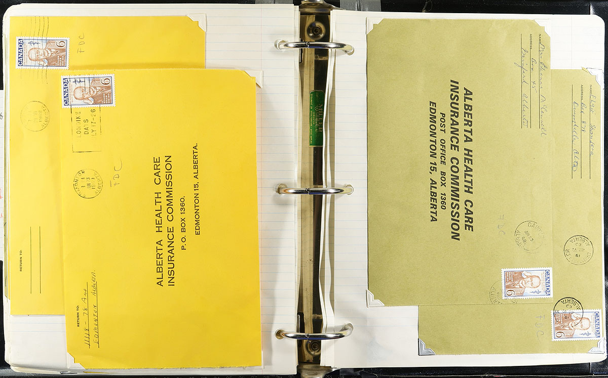 QEII Postal History Part 2. Five binders of commercial covers from 1969-1972 by a collector who was fascinated by the fluorescent paper experiments of the time and had access to a large source of mail. This group contains 2 binders of the "Osler" and 1 of the "ILO" issues with commercial first day covers. There is a binder of the 6c orange Centennial, with stamps purported to have various degrees of fluorescent paper. The lot ends with a binder of 6c black cut squares with a wide range of machine, slogan and CDS cancels. Almost all the cancels in this lot are from Alberta. A great lot for the collector with a good UV light. Several hundred covers and a few hundred cut squares. Estimate =