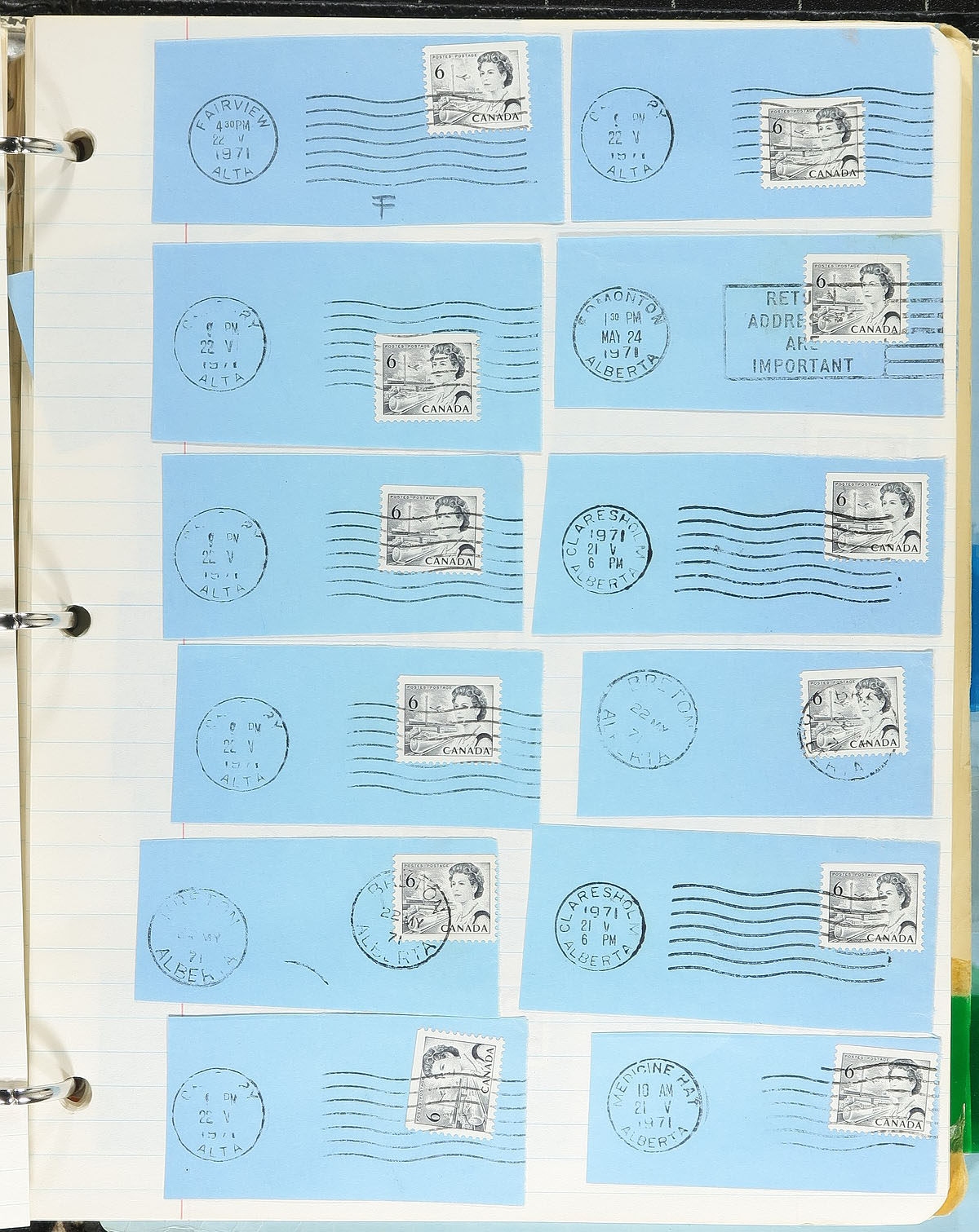 QEII Postal History Part 2. Five binders of commercial covers from 1969-1972 by a collector who was fascinated by the fluorescent paper experiments of the time and had access to a large source of mail. This group contains 2 binders of the "Osler" and 1 of the "ILO" issues with commercial first day covers. There is a binder of the 6c orange Centennial, with stamps purported to have various degrees of fluorescent paper. The lot ends with a binder of 6c black cut squares with a wide range of machine, slogan and CDS cancels. Almost all the cancels in this lot are from Alberta. A great lot for the collector with a good UV light. Several hundred covers and a few hundred cut squares. Estimate =