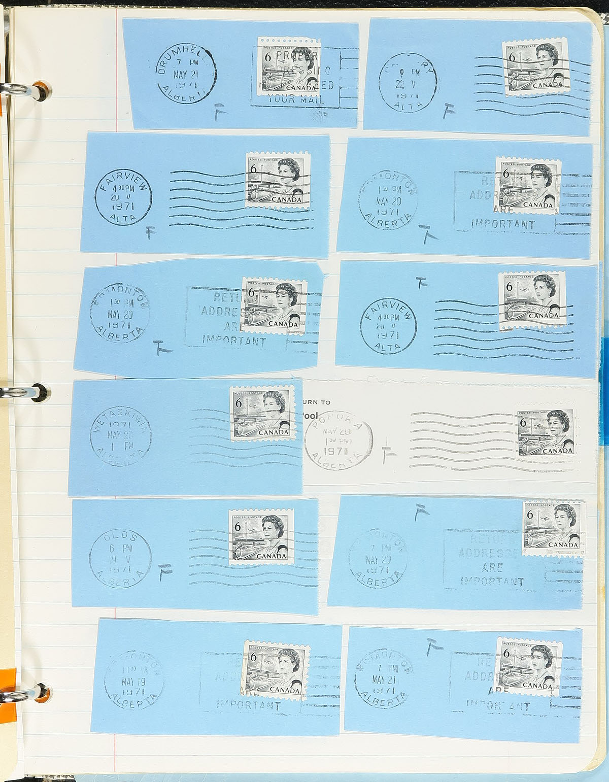 QEII Postal History Part 2. Five binders of commercial covers from 1969-1972 by a collector who was fascinated by the fluorescent paper experiments of the time and had access to a large source of mail. This group contains 2 binders of the "Osler" and 1 of the "ILO" issues with commercial first day covers. There is a binder of the 6c orange Centennial, with stamps purported to have various degrees of fluorescent paper. The lot ends with a binder of 6c black cut squares with a wide range of machine, slogan and CDS cancels. Almost all the cancels in this lot are from Alberta. A great lot for the collector with a good UV light. Several hundred covers and a few hundred cut squares. Estimate =