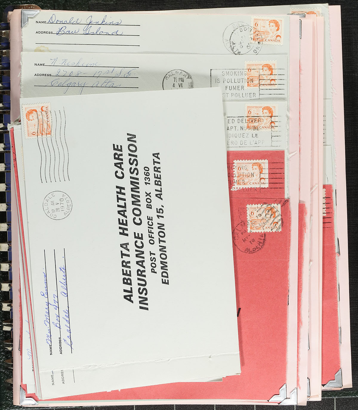 QEII Postal History Part 3. Seven binders of Centennial covers, one with a 6c black, 6c orange (2 binders) with stamps on fluorescent paper (sorted for different perforation types and some which may be booklet singles), a binder of 6c black on regular paper, with coils, binder of 7c covers and a binder with 6c and 7c stamps made up to the 7c and 8c rates (a few are postage dues). About 1000 covers here, with an interesting hoard of contemporary covers, perfect for the student of fluorescent paper usage, as almost every item comes with a dated, Alberta cancel. Estimate =
