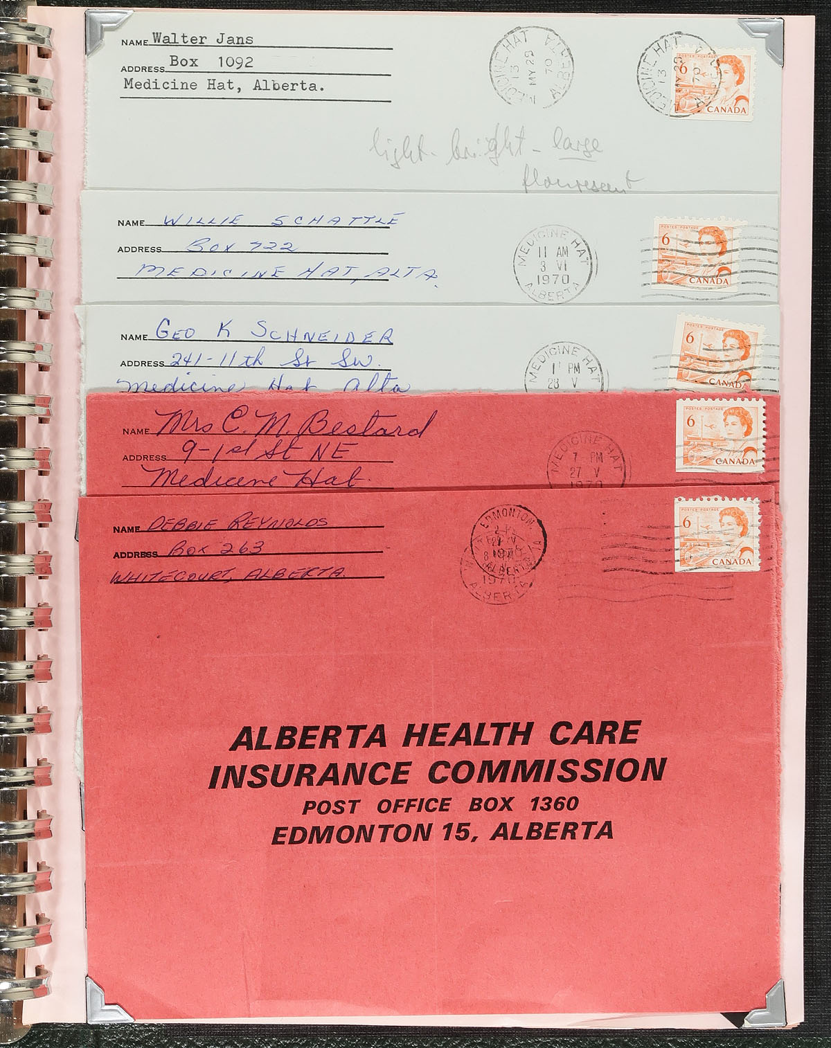 QEII Postal History Part 3. Seven binders of Centennial covers, one with a 6c black, 6c orange (2 binders) with stamps on fluorescent paper (sorted for different perforation types and some which may be booklet singles), a binder of 6c black on regular paper, with coils, binder of 7c covers and a binder with 6c and 7c stamps made up to the 7c and 8c rates (a few are postage dues). About 1000 covers here, with an interesting hoard of contemporary covers, perfect for the student of fluorescent paper usage, as almost every item comes with a dated, Alberta cancel. Estimate =