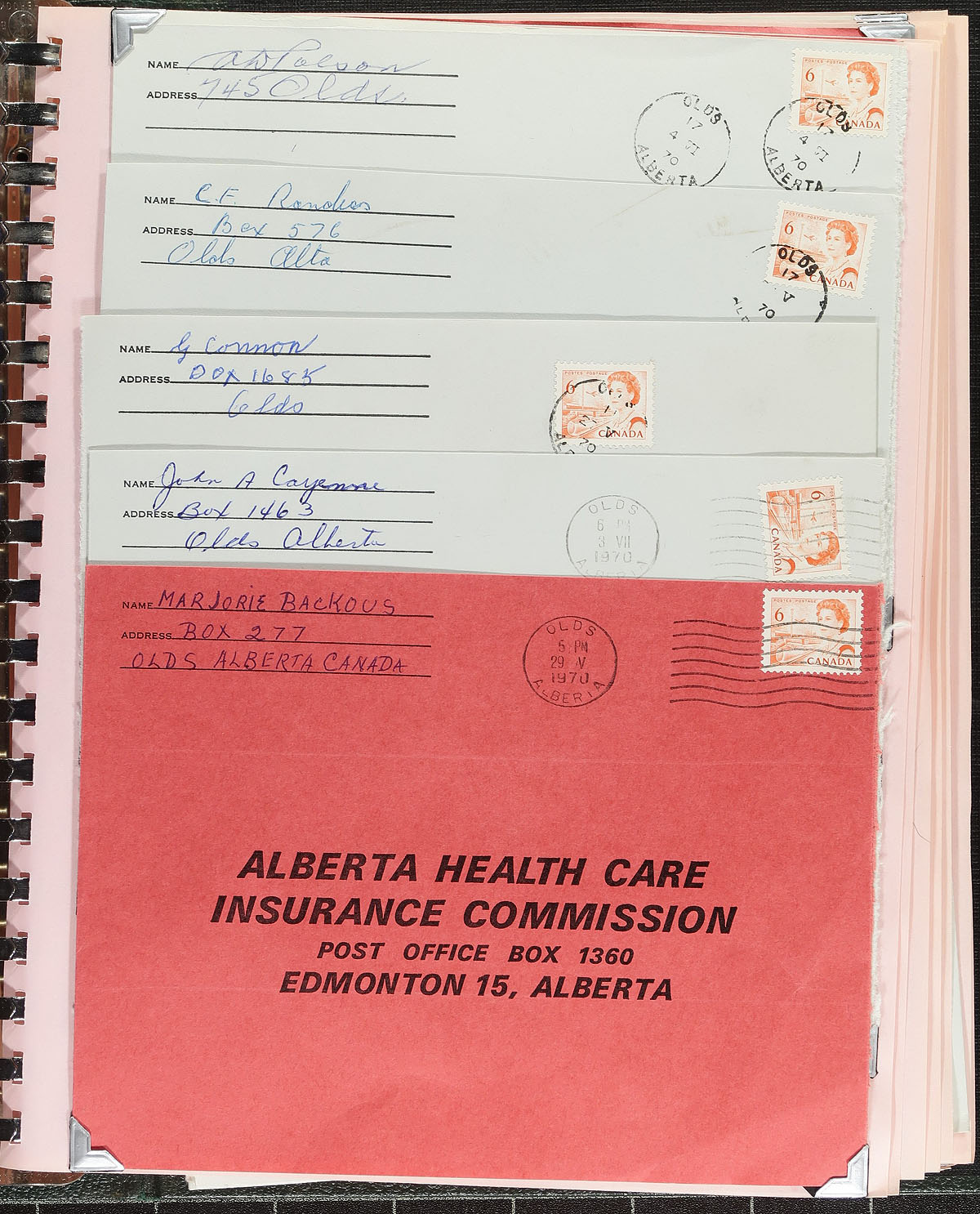 QEII Postal History Part 3. Seven binders of Centennial covers, one with a 6c black, 6c orange (2 binders) with stamps on fluorescent paper (sorted for different perforation types and some which may be booklet singles), a binder of 6c black on regular paper, with coils, binder of 7c covers and a binder with 6c and 7c stamps made up to the 7c and 8c rates (a few are postage dues). About 1000 covers here, with an interesting hoard of contemporary covers, perfect for the student of fluorescent paper usage, as almost every item comes with a dated, Alberta cancel. Estimate =