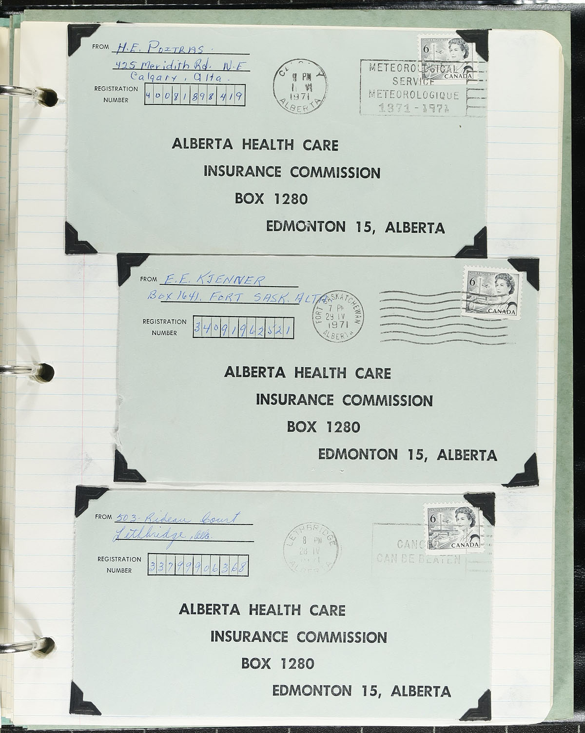 QEII Postal History Part 3. Seven binders of Centennial covers, one with a 6c black, 6c orange (2 binders) with stamps on fluorescent paper (sorted for different perforation types and some which may be booklet singles), a binder of 6c black on regular paper, with coils, binder of 7c covers and a binder with 6c and 7c stamps made up to the 7c and 8c rates (a few are postage dues). About 1000 covers here, with an interesting hoard of contemporary covers, perfect for the student of fluorescent paper usage, as almost every item comes with a dated, Alberta cancel. Estimate =