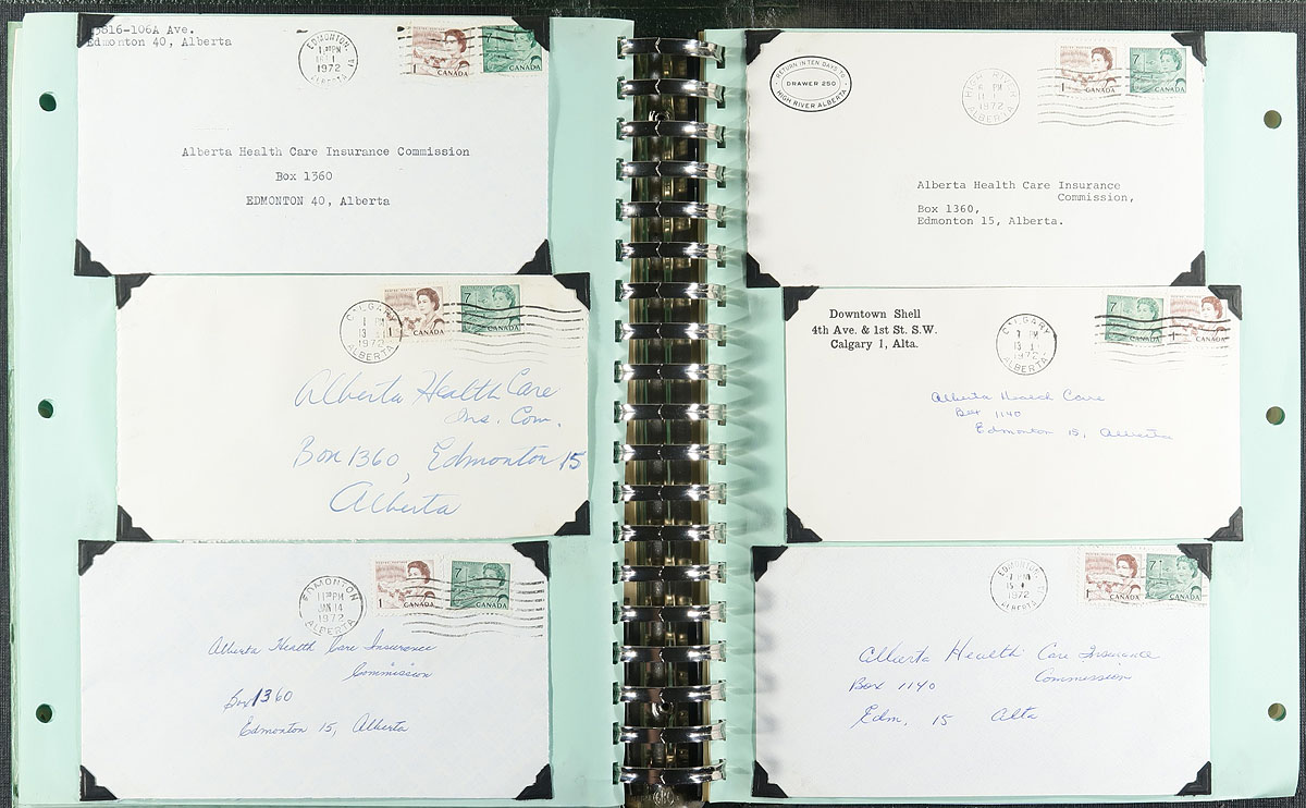 QEII Postal History Part 3. Seven binders of Centennial covers, one with a 6c black, 6c orange (2 binders) with stamps on fluorescent paper (sorted for different perforation types and some which may be booklet singles), a binder of 6c black on regular paper, with coils, binder of 7c covers and a binder with 6c and 7c stamps made up to the 7c and 8c rates (a few are postage dues). About 1000 covers here, with an interesting hoard of contemporary covers, perfect for the student of fluorescent paper usage, as almost every item comes with a dated, Alberta cancel. Estimate =