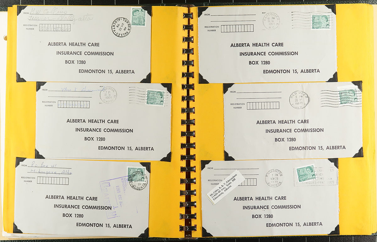 QEII Postal History Part 3. Seven binders of Centennial covers, one with a 6c black, 6c orange (2 binders) with stamps on fluorescent paper (sorted for different perforation types and some which may be booklet singles), a binder of 6c black on regular paper, with coils, binder of 7c covers and a binder with 6c and 7c stamps made up to the 7c and 8c rates (a few are postage dues). About 1000 covers here, with an interesting hoard of contemporary covers, perfect for the student of fluorescent paper usage, as almost every item comes with a dated, Alberta cancel. Estimate =