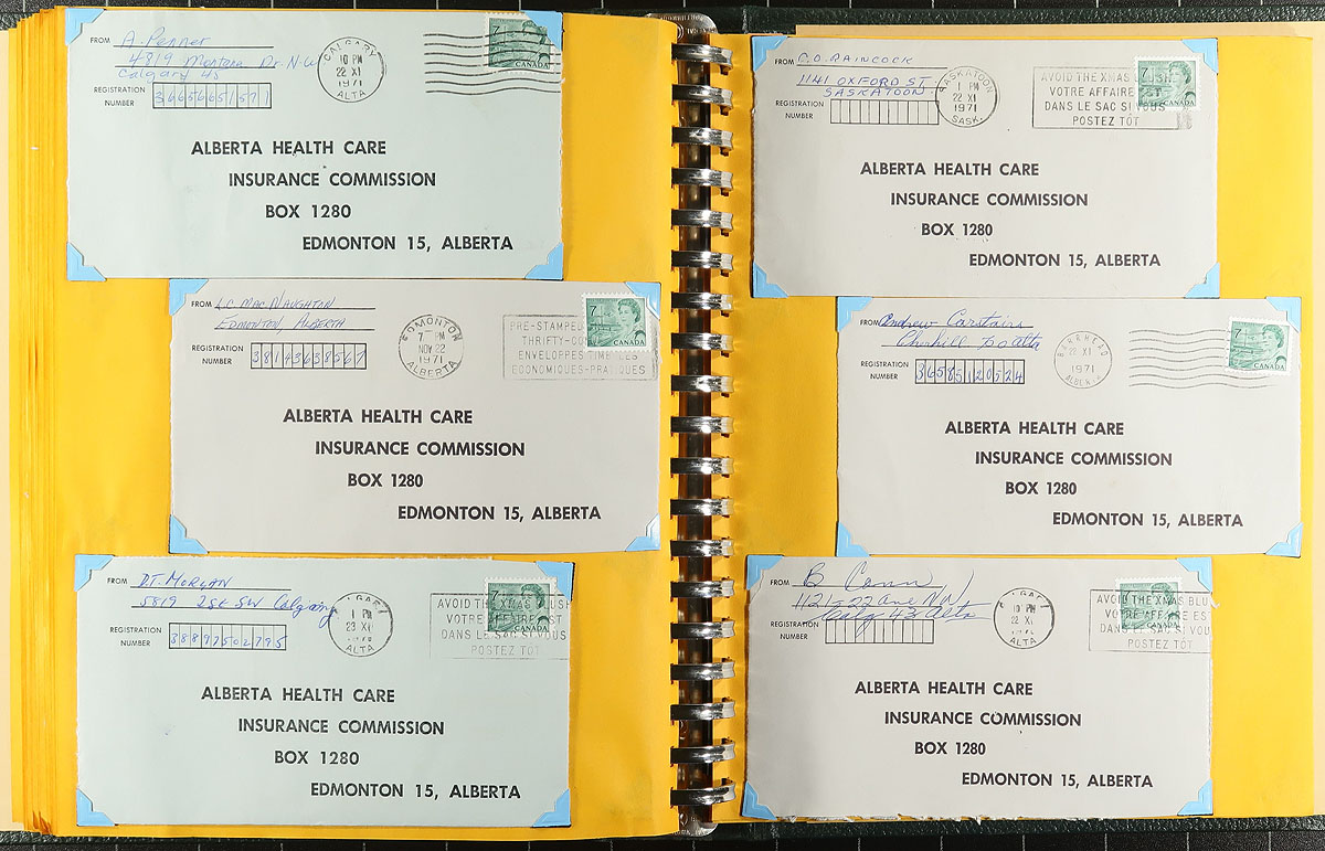 QEII Postal History Part 3. Seven binders of Centennial covers, one with a 6c black, 6c orange (2 binders) with stamps on fluorescent paper (sorted for different perforation types and some which may be booklet singles), a binder of 6c black on regular paper, with coils, binder of 7c covers and a binder with 6c and 7c stamps made up to the 7c and 8c rates (a few are postage dues). About 1000 covers here, with an interesting hoard of contemporary covers, perfect for the student of fluorescent paper usage, as almost every item comes with a dated, Alberta cancel. Estimate =