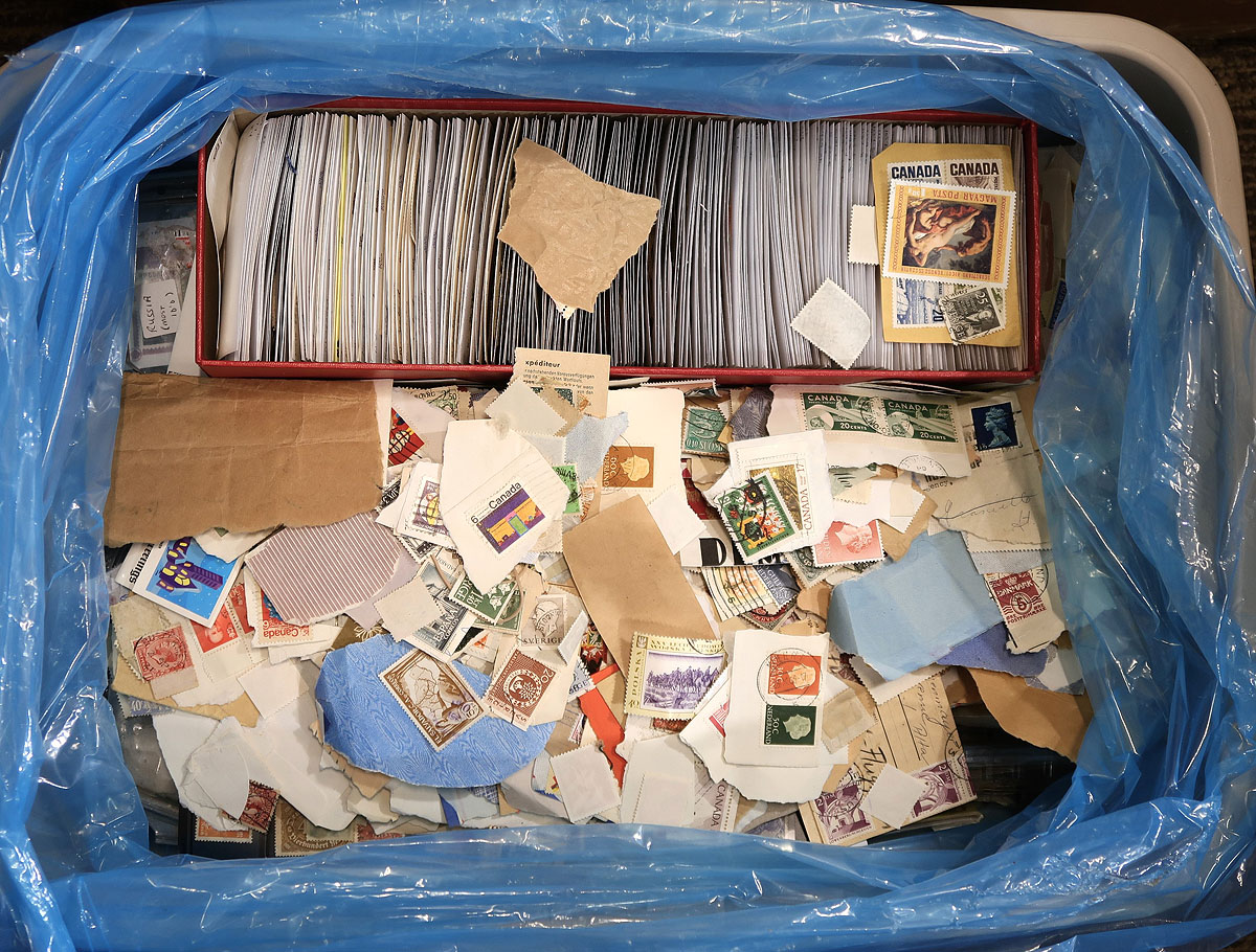 A 68-litre Rubbermaid bin filled with the remnants of several estates. Much is loose both "on and off" paper (some sorted in envelopes or baggies, others "free range"). There is some which is a bit more organized including some mounted material, some dealer packs, new issue folders and even saw a red dealer’s box filled with "102" cards, which seems to be mostly "M" and "N" countries. Otherwise, the material is from almost everywhere, with each handful turning up something new. If you like cheap entertainment that will occupy several hours of your time and with a distinct possibility of pulling out better singles, this lot is for you. Estimate =