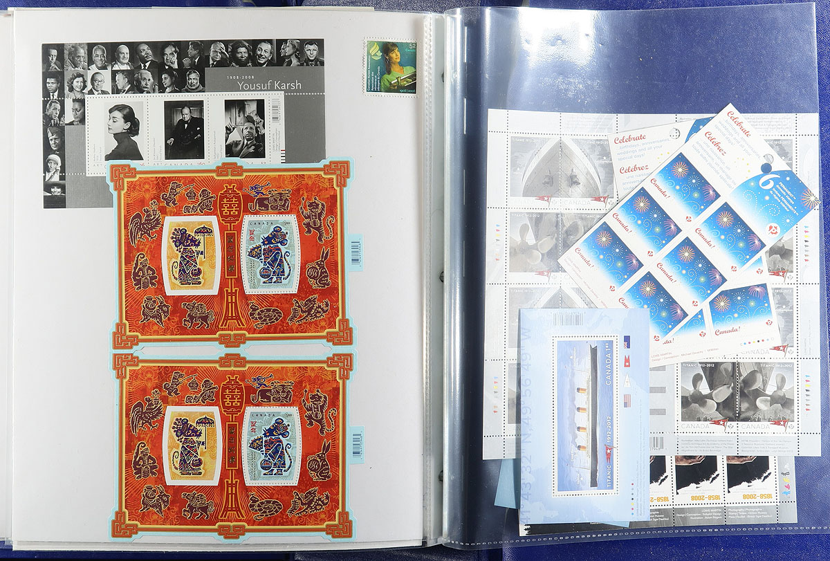 A regular Unitrade album with pages to 2007 in a large (and indestructible) industrial binder, with stamps up to the Titanic 2012 issue. The stamps mounted to the page are mostly used examples, with thin coverage up to King George VI and then hit or miss for the balance (but there are about 700 stamps in total). Interspersed within the album are a number of plastic folders or page protectors with assorted mint stamps, sheetlets, souvenir sheets, Canada Post packs, etc. from the 8c era forward have a total face value. The face value alone adds up to over $200.00. Estimate =