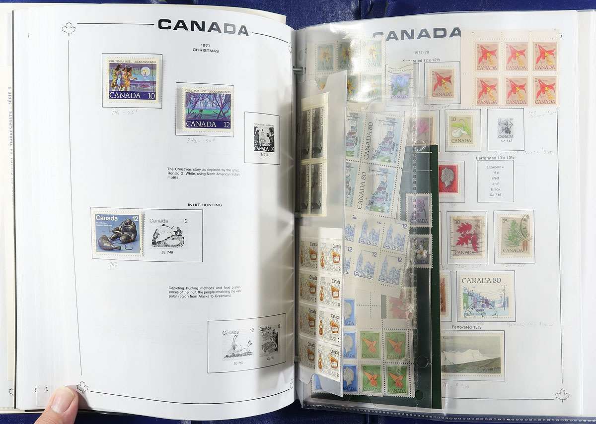 A regular Unitrade album with pages to 2007 in a large (and indestructible) industrial binder, with stamps up to the Titanic 2012 issue. The stamps mounted to the page are mostly used examples, with thin coverage up to King George VI and then hit or miss for the balance (but there are about 700 stamps in total). Interspersed within the album are a number of plastic folders or page protectors with assorted mint stamps, sheetlets, souvenir sheets, Canada Post packs, etc. from the 8c era forward have a total face value. The face value alone adds up to over $200.00. Estimate =