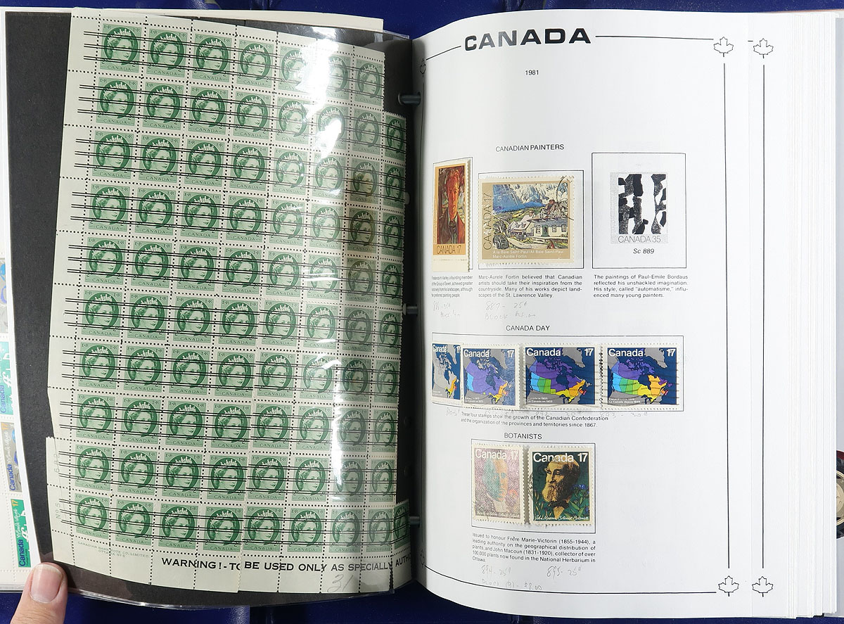 A regular Unitrade album with pages to 2007 in a large (and indestructible) industrial binder, with stamps up to the Titanic 2012 issue. The stamps mounted to the page are mostly used examples, with thin coverage up to King George VI and then hit or miss for the balance (but there are about 700 stamps in total). Interspersed within the album are a number of plastic folders or page protectors with assorted mint stamps, sheetlets, souvenir sheets, Canada Post packs, etc. from the 8c era forward have a total face value. The face value alone adds up to over $200.00. Estimate =