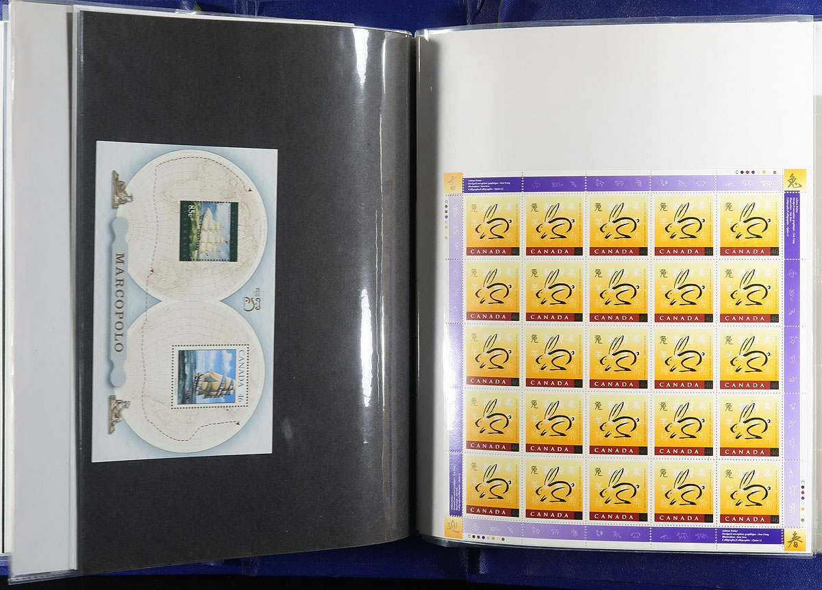 A regular Unitrade album with pages to 2007 in a large (and indestructible) industrial binder, with stamps up to the Titanic 2012 issue. The stamps mounted to the page are mostly used examples, with thin coverage up to King George VI and then hit or miss for the balance (but there are about 700 stamps in total). Interspersed within the album are a number of plastic folders or page protectors with assorted mint stamps, sheetlets, souvenir sheets, Canada Post packs, etc. from the 8c era forward have a total face value. The face value alone adds up to over $200.00. Estimate =