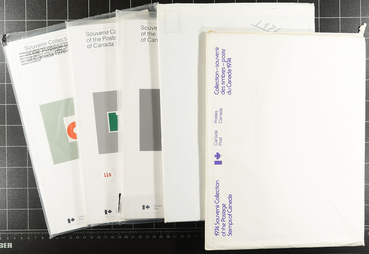 Annual collections 1974-1979, including the good 1974 (without hole punch), 1975 and 1976 in their original packaging. The stamps have been placed in their clear mounts. The stamps are complete and in perfect condition, the folders/booklets are in excellent condition and the packaging has a bit of minor damage (and "1976" has a pencil notation on the front). Under-appreciated in their day, or had the stamps removed and the booklets tossed. 2024 Unitrade =