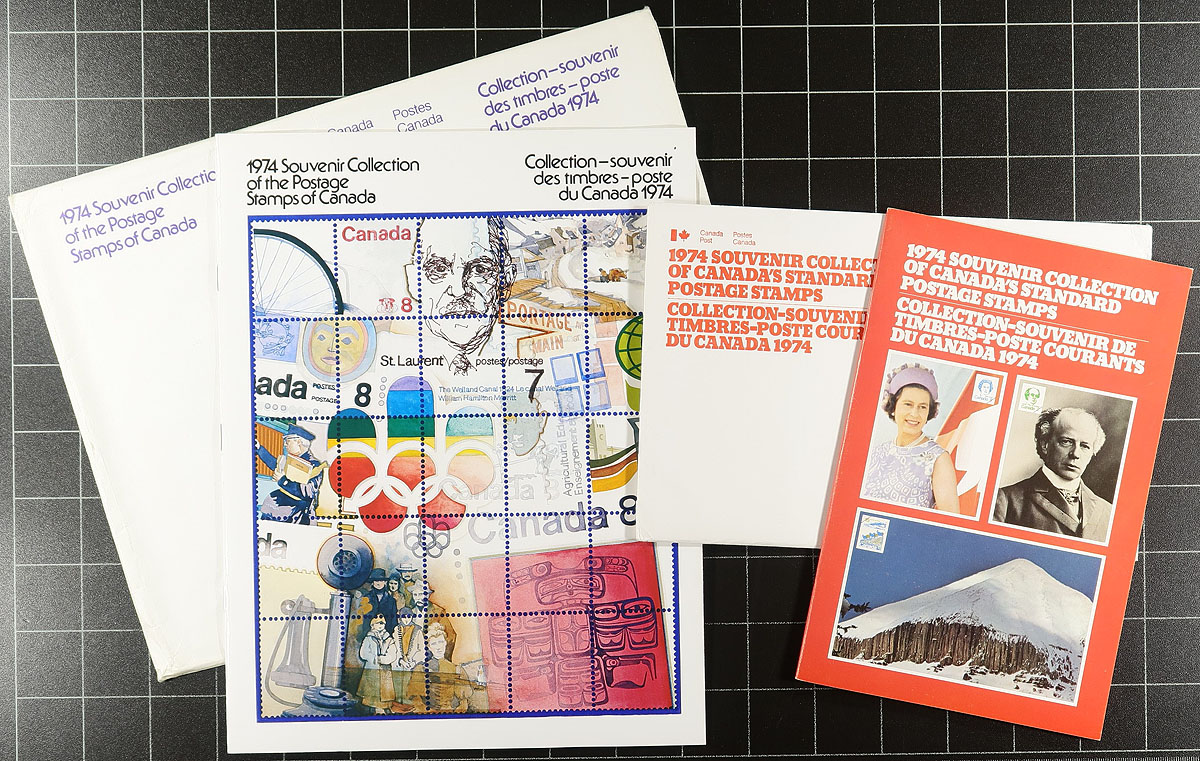 Annual collections 1974-1979, including the good 1974 (without hole punch), 1975 and 1976 in their original packaging. The stamps have been placed in their clear mounts. The stamps are complete and in perfect condition, the folders/booklets are in excellent condition and the packaging has a bit of minor damage (and "1976" has a pencil notation on the front). Under-appreciated in their day, or had the stamps removed and the booklets tossed. 2024 Unitrade =