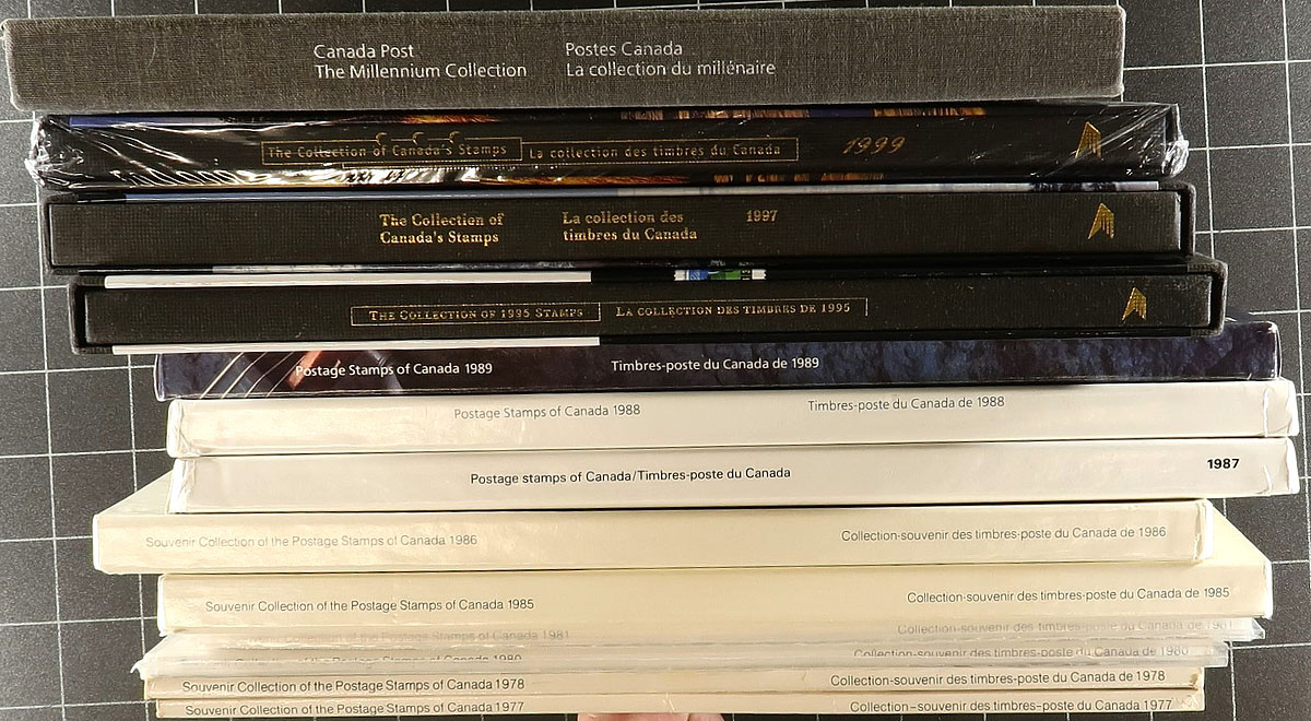 Annual collections ranging from 1977 to 1999 (not inclusive) plus the 2000 Millennium collection. All are complete, in their original packaging, box or slipcover. All but two have the stamps already in the clear mounts. Includes 1977-78, 1980-81, 1985-89, 1995, 1997 and 1999 (in unopened cellophane). In near-new condition. Total face value of the stamps alone is $252.51. 2024 Unitrade =