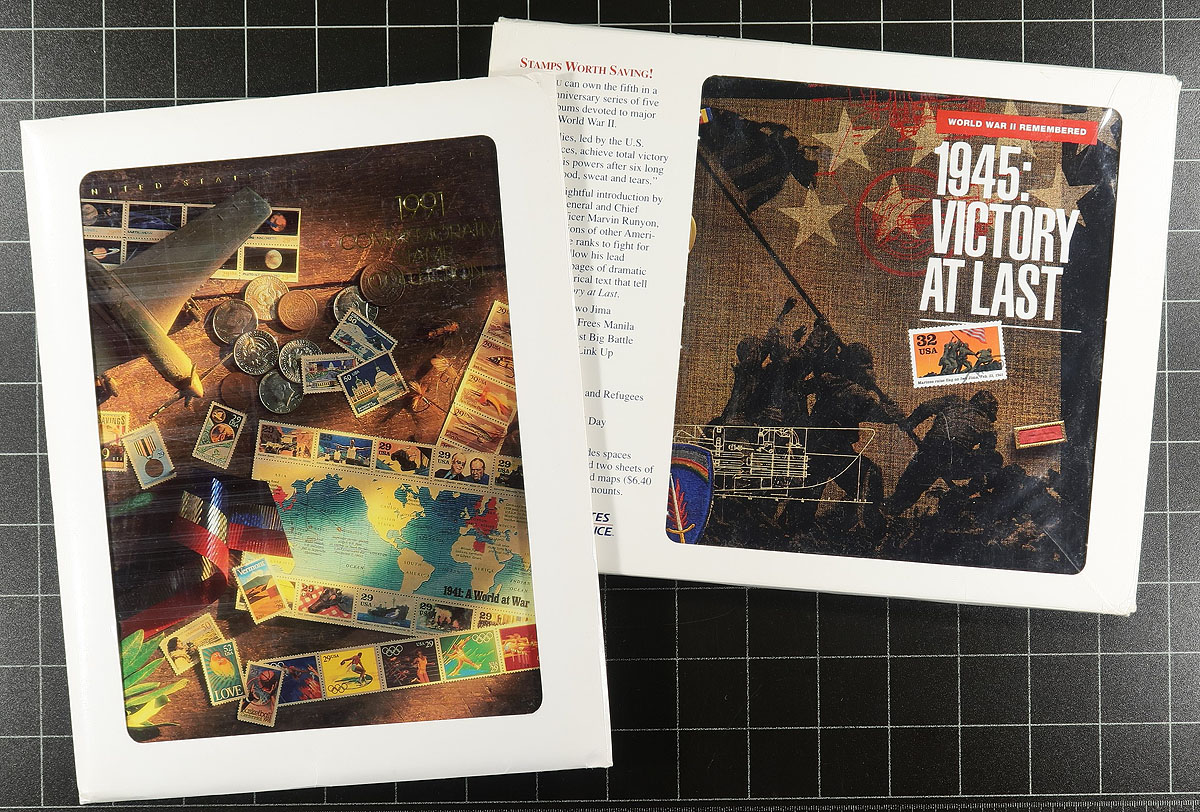 Near complete run of 1973-1999 annual commemorative year sets, missing only 1996, plus a bonus 1986 Ameripex "Presidents" set of 4 sheetlets and all five of the WWII anniversary booklets. Almost all are in their original packaging, with a few having text added in pen on the spine. Most have the stamps in their mounts. The stamps are in excellent condition. Total face value (well less than the original retail price) is US$355.25 =