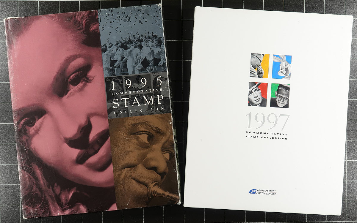 Near complete run of 1973-1999 annual commemorative year sets, missing only 1996, plus a bonus 1986 Ameripex "Presidents" set of 4 sheetlets and all five of the WWII anniversary booklets. Almost all are in their original packaging, with a few having text added in pen on the spine. Most have the stamps in their mounts. The stamps are in excellent condition. Total face value (well less than the original retail price) is US$355.25 =