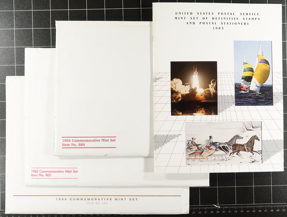 Near complete run of 1973-1999 annual commemorative year sets, missing only 1996, plus a bonus 1986 Ameripex "Presidents" set of 4 sheetlets and all five of the WWII anniversary booklets. Almost all are in their original packaging, with a few having text added in pen on the spine. Most have the stamps in their mounts. The stamps are in excellent condition. Total face value (well less than the original retail price) is US$355.25 =