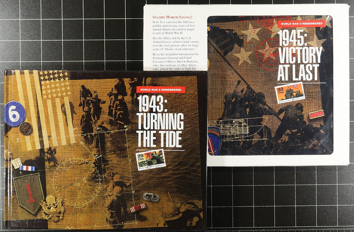 Near complete run of 1973-1999 annual commemorative year sets, missing only 1996, plus a bonus 1986 Ameripex "Presidents" set of 4 sheetlets and all five of the WWII anniversary booklets. Almost all are in their original packaging, with a few having text added in pen on the spine. Most have the stamps in their mounts. The stamps are in excellent condition. Total face value (well less than the original retail price) is US$355.25 =