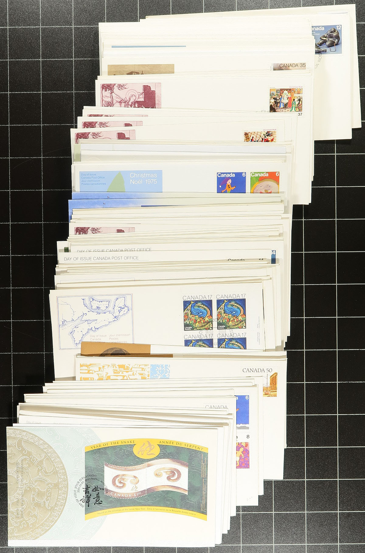 First Day Covers. Official Canada Post First Day Cover mini-hoard of about 750 covers issued 1971-2012 with singles, pairs, plate blocks, souvenir sheets, with some collection packs and one "with compliments" folder. Not a complete run, with light duplication (often because of a single/pair/set/plate block). Almost all are cacheted and unaddressed. Overall the condition is quite nice. Estimate =