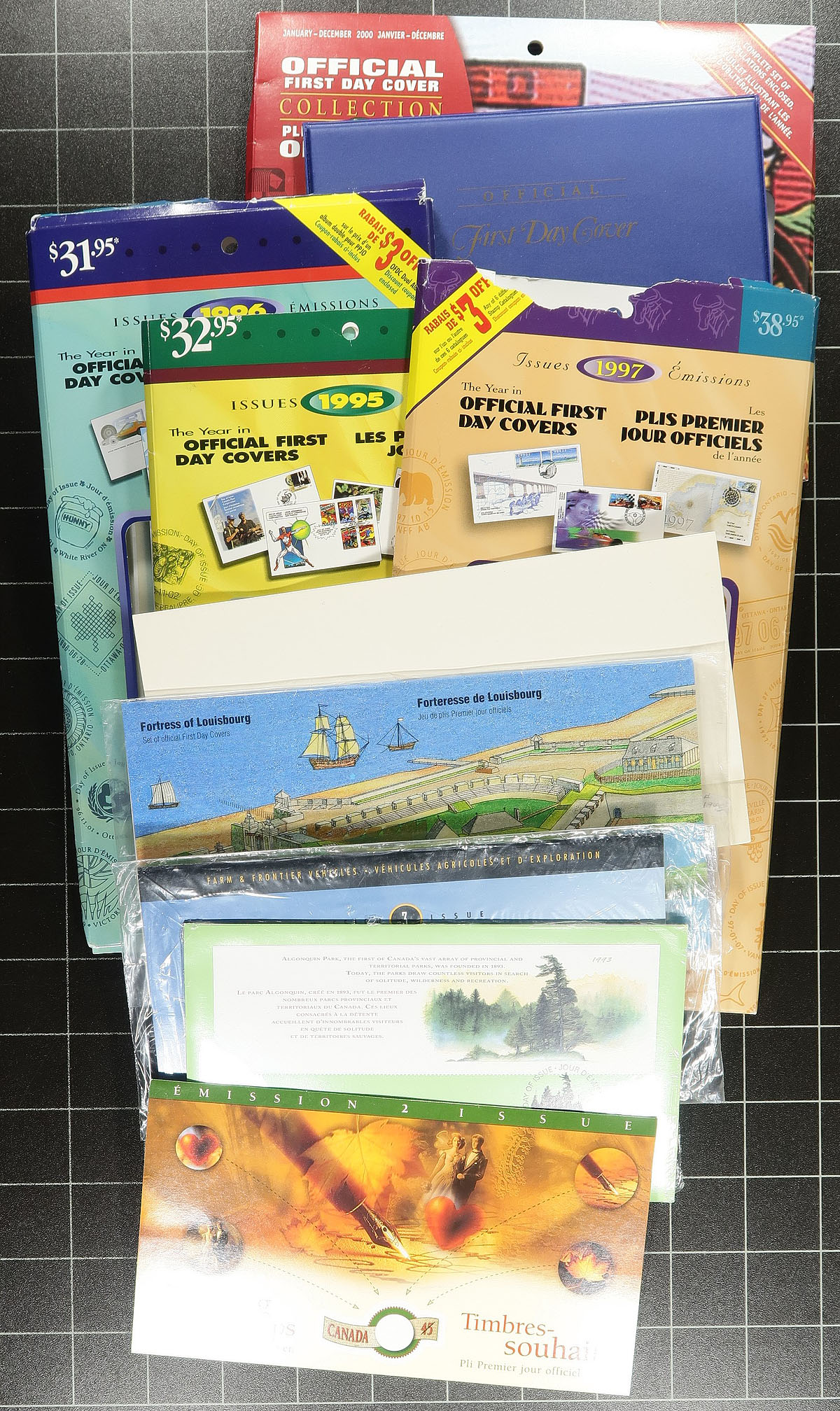 First Day Covers. Official Canada Post First Day Cover mini-hoard of about 750 covers issued 1971-2012 with singles, pairs, plate blocks, souvenir sheets, with some collection packs and one "with compliments" folder. Not a complete run, with light duplication (often because of a single/pair/set/plate block). Almost all are cacheted and unaddressed. Overall the condition is quite nice. Estimate =