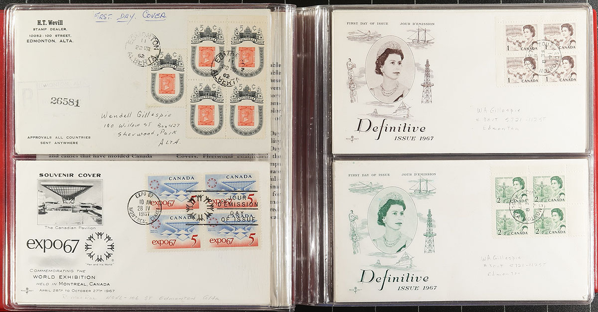First Day Covers. Remarkable holding of about 900, mostly different, private First Day cover cachets in albums and piles, desperately needing sorting and discovery. From 1948 to about 1985 with about a dozen different cachet makers represented. The 1960’s to 1970’s is often Rosecraft, but we noted about 50 long "Schering" FDCs. The strength is about a 10-year run each of "NR" and "Fleetwood" cachets. The "NR" covers are a bit primitive and were produced in relatively small quantities and we rarely see such a complete offering. Fleetwood covers are much more sophisticated but were very pricey (e.g. the 1983 Canada Day series of 12 covers cost US$30.00!). Great for the researcher or for the collector who wants to fill in what they couldn’t afford 40 years ago! Estimate =