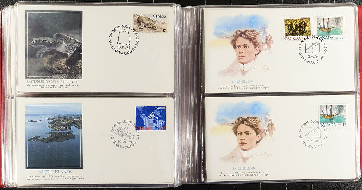 First Day Covers. Remarkable holding of about 900, mostly different, private First Day cover cachets in albums and piles, desperately needing sorting and discovery. From 1948 to about 1985 with about a dozen different cachet makers represented. The 1960’s to 1970’s is often Rosecraft, but we noted about 50 long "Schering" FDCs. The strength is about a 10-year run each of "NR" and "Fleetwood" cachets. The "NR" covers are a bit primitive and were produced in relatively small quantities and we rarely see such a complete offering. Fleetwood covers are much more sophisticated but were very pricey (e.g. the 1983 Canada Day series of 12 covers cost US$30.00!). Great for the researcher or for the collector who wants to fill in what they couldn’t afford 40 years ago! Estimate =