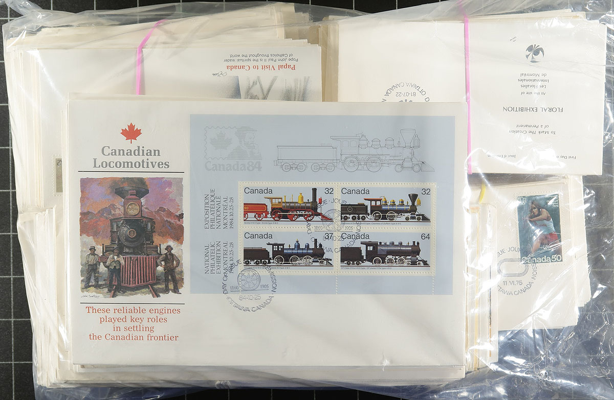 First Day Covers. Remarkable holding of about 900, mostly different, private First Day cover cachets in albums and piles, desperately needing sorting and discovery. From 1948 to about 1985 with about a dozen different cachet makers represented. The 1960’s to 1970’s is often Rosecraft, but we noted about 50 long "Schering" FDCs. The strength is about a 10-year run each of "NR" and "Fleetwood" cachets. The "NR" covers are a bit primitive and were produced in relatively small quantities and we rarely see such a complete offering. Fleetwood covers are much more sophisticated but were very pricey (e.g. the 1983 Canada Day series of 12 covers cost US$30.00!). Great for the researcher or for the collector who wants to fill in what they couldn’t afford 40 years ago! Estimate =