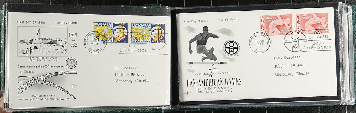 First Day Covers. Remarkable holding of about 900, mostly different, private First Day cover cachets in albums and piles, desperately needing sorting and discovery. From 1948 to about 1985 with about a dozen different cachet makers represented. The 1960’s to 1970’s is often Rosecraft, but we noted about 50 long "Schering" FDCs. The strength is about a 10-year run each of "NR" and "Fleetwood" cachets. The "NR" covers are a bit primitive and were produced in relatively small quantities and we rarely see such a complete offering. Fleetwood covers are much more sophisticated but were very pricey (e.g. the 1983 Canada Day series of 12 covers cost US$30.00!). Great for the researcher or for the collector who wants to fill in what they couldn’t afford 40 years ago! Estimate =